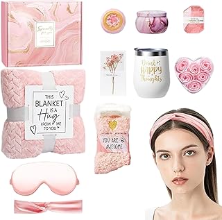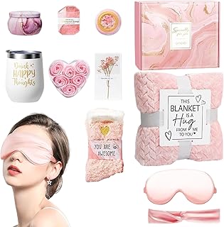 Price ~ $100.12 Thoughtfully designed with feminine details, this luxurious self-care collection includes a plush throw blanket and curated items for a soothing ritual. Experience stress relief with an aromatherapy candle, floral-scented soap bar, and flower bath tablet for a calming ambiance. Perfect for birthdays or Mother’s Day, this versatile basket design makes it an…